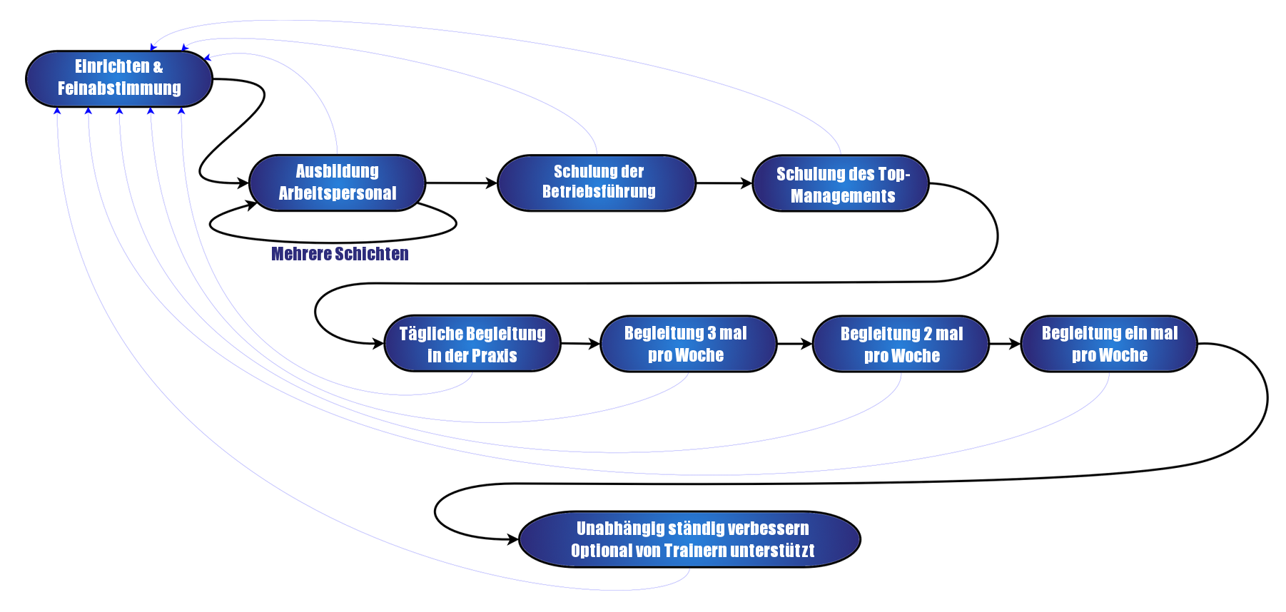 Die unten beschriebene allgemeine Schulungsmethode wird an jeden einzelnen Kunden und dessen Anwendungsbereich angepasst, sei es Operational Exzellenz, HSE und/oder 5S. Dadurch wird sichergestellt, dass Ihr Unternehmen bei der optimalen Nutzung und Schulung von ProMISe durch Ihre Mitarbeiter völlig autonom ist.